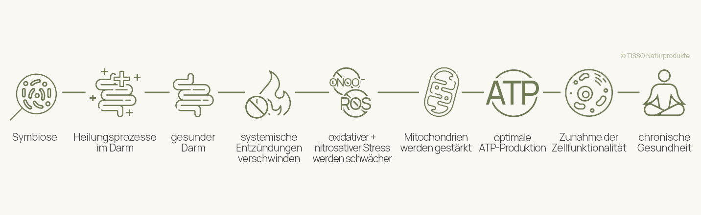 Gesunde Mitochondrien brauchen einen gesunden Darm ‒ und ein gesunder Darm braucht gesunde Mitochondrien. Das MitoBiom®-Konzept setzt genau hier an: Es zielt darauf ab, das lebenswichtige Mikrobiom und die Darmbarriere wiederherzustellen und gleichzeitig die Mitochondrien in den Körperzellen zu stärken.